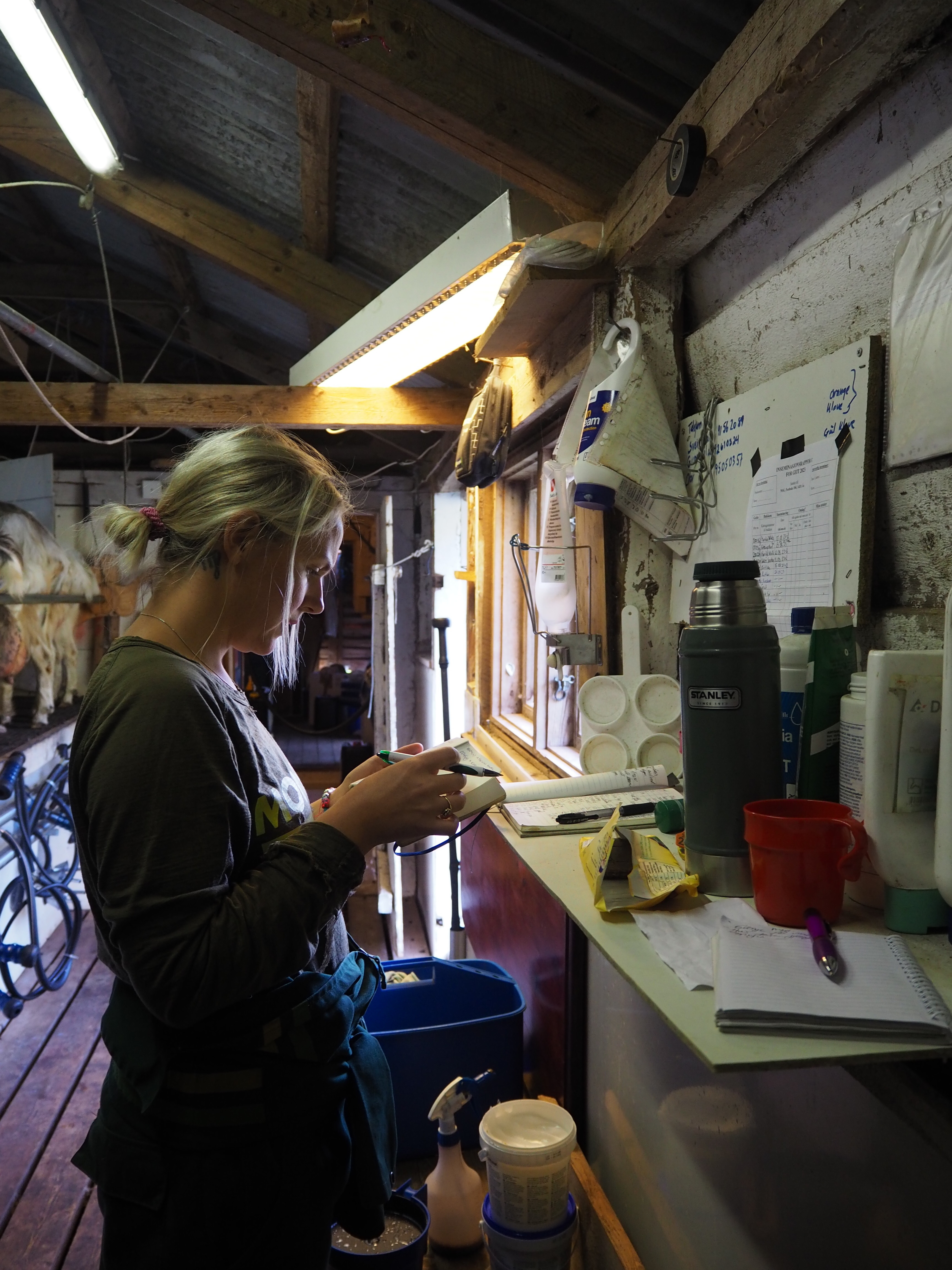 Man slår på pumpa her, trekker i ei snor der, drar i en spak, dytter på ei geit her, springer inn gjennom en port, husker å lukke etter seg, fyller fôr, løper tilbake og – phu, stenger porten igjen – i en og samme operasjon. Er du rask og effektiv kan morgenmelking være over etter en økt på 1 ½ timer. Deretter følger rens av maskiner og skraping av møkk. Alt dette mens melka trygt oppbevares i en tank som rommer 1200 liter. For på Samastad har det aldri blitt hverken ystet eller kjernet. Stølen baserer seg på at melkebilen kommer. Annen hver dag kjører den de 25 kilometerne fra Tines meieri på Haukeli, den snirkler seg opp etter kjerreveien, runder svinger, parerer oversvømte bekker og først ved grinda hopper sjøføren ut. Er han heldig er det budeia som åpner for ham.