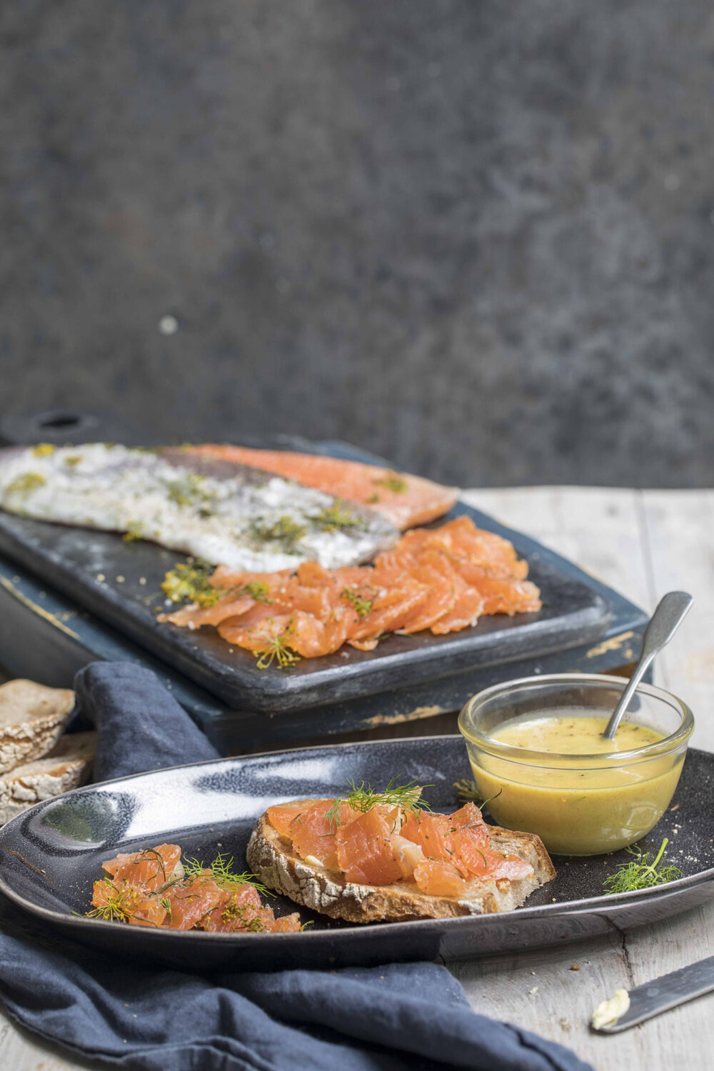 - Bland sukker og salt i forholdet 6 deler salt og 4 deler sukker. Strø litt av blandingen i et dypt fat sammen med dill. Legg fisken med skinnsiden ned, strø med mer av blandingen og strø over dill. Legg den andre fileten med kjøttsiden ned mot den ferdig krydrede fileten, og strø på mer salt, sukker og dill. Dekk fatet med folie.
