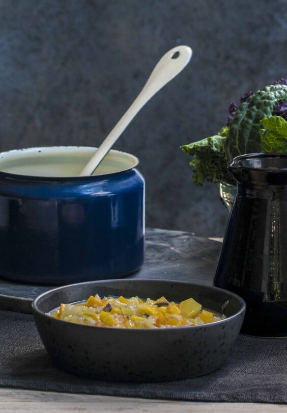 Kok opp vann og sukker i en liten kjele. Ha deretter i soppen og la den småkoke i en halvtimes tid. Rør litt forsiktig innimellom. Soppen blir etter hvert gyllenbrun og litt glassaktig.